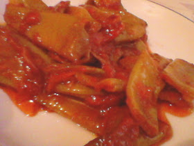 2 domates rendelenir..İnce doğranmış çarliston biberler yağda kavrulur..rendelenen domatesler eklenerek pişirilir...