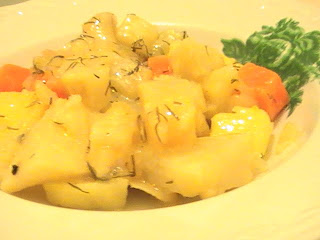 Kerevizler küp küp doğranıp unlu suda bekletilir kararmaması için..Soğan,havuç patates kavrulur kerevizler eklenip kavurmaya devam edilir..2 portakalın suyu süzülüp yemeğe eklenir..dereotu,tuz ve karabiber konulur ve çok az su ilavesiyle kısık ateşte pişirilir..