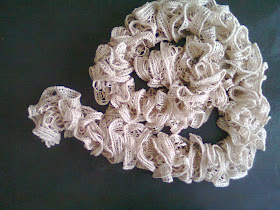 Son zamanların moda fularının ipinin hazır satıldığını bilmiyordum ben..Görünce bayıldım..6 numara şişle 5 ilmek atarak ördüm..Bazıları 3 boşluk bırakmış örerken ben 2 boşluk bıraktım her ilmek arasında..Yani 1. değil 2. boşluğu aldım..Bu şekilde de fırfırlı durdu ancak daha tok olmasını sağladı..Zaten yapılışı ürün kağıdının arkasında da yazıyor..Çok kolay ve örmesi çok zevkli..1,5 saatte bitirdim..